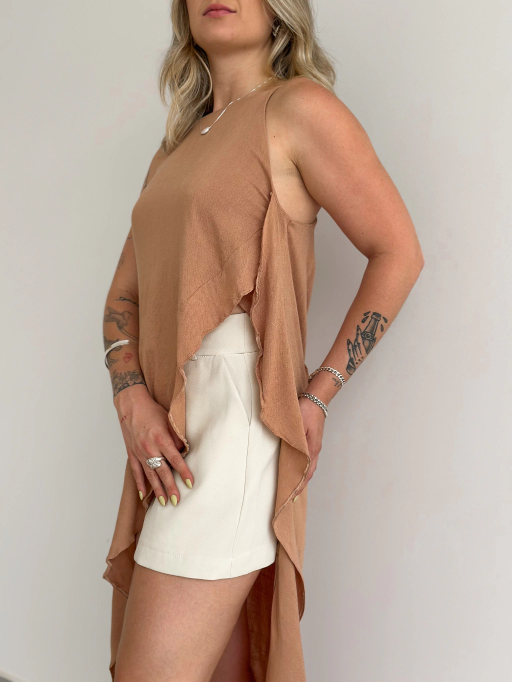 A Túnica Assimétrica Almeria possui um babado na lateral, detalhe nas costas que podem ser regulaveis e alças finas reguláveis. Tem um caimento perfeito, podendo ser usada a amarração de 2 formas.